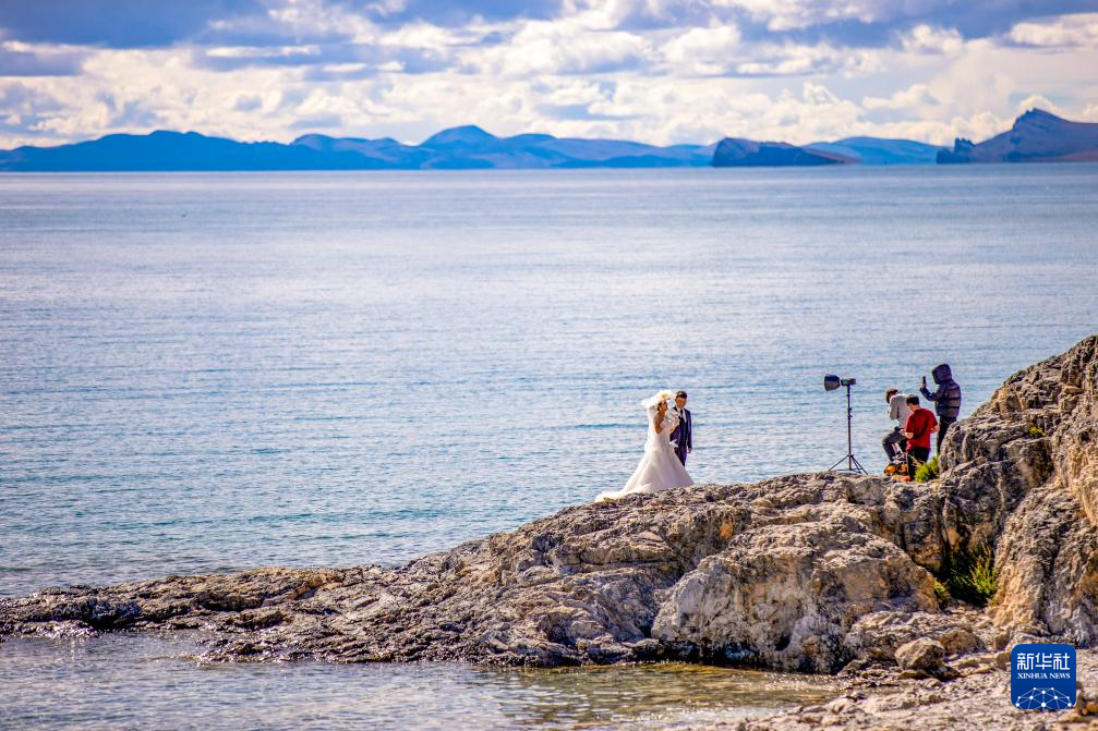 游客在納木錯湖邊拍攝婚紗照(9月16日攝)。新華社記者 姜帆 攝