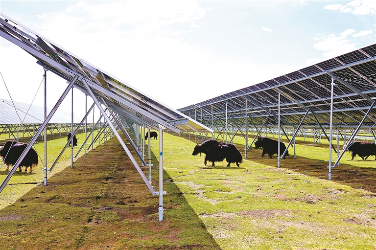 在華電羅布沙光伏項目區(qū),整齊的光伏板陣列與圣潔的雪山共同構(gòu)成獨特景致。光伏板下,回鋪的草甸悄然復蘇,牦牛悠然其間覓食,形成獨特的“牧光互補”模式,實現(xiàn)了生態(tài)保護與清潔能源生產(chǎn)的雙贏。