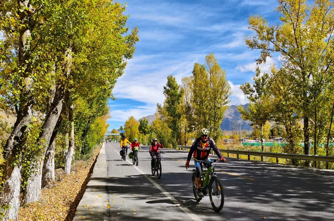 圖為自行車隊(duì)在拉薩市曲水縣秋意盎然的國道騎行。記者 次仁平措 攝