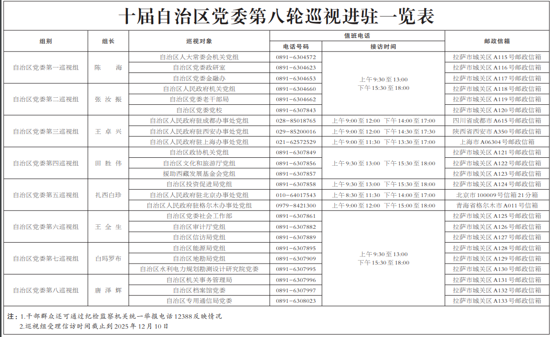 據(jù)悉,各巡視組將在被巡視單位工作50天左右,期間設專門值班電話和郵政信箱,開通信訪意見箱等信訪渠道,主要受理反映被巡視黨組織領導班子及其成員、下一級黨組織主要負責人和重要崗位領導干部問題的來信來電來訪,重點是關于違反政治紀律、組織紀律、廉潔紀律、群眾紀律、工作紀律、生活紀律等方面的舉報和反映。巡視組受理信訪時間截止到2025年12月10日。
