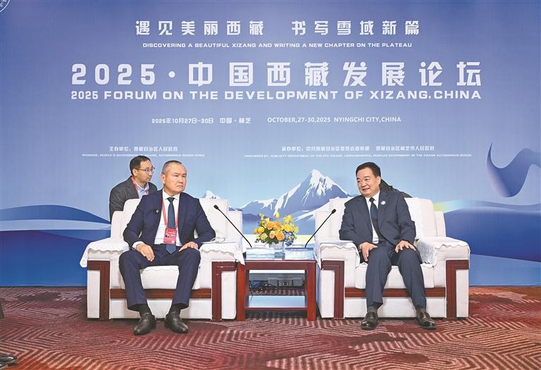 10月28日,自治區(qū)黨委書(shū)記王君正在林芝會(huì)見(jiàn)參加2025·中國(guó)西藏發(fā)展論壇的外國(guó)政要和駐華使節(jié)。這是王君正會(huì)見(jiàn)聯(lián)合國(guó)秘書(shū)長(zhǎng)古特雷斯先生的代表,聯(lián)合國(guó)教科文組織駐華代表、東亞辦事處主任兼代表夏澤翰。本報(bào)記者 旦增西旦 攝