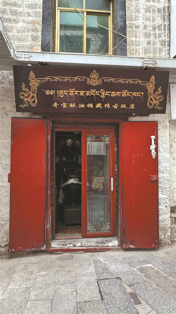 在八廓街,記者看到一家名為“奇寶酥油桶藏傳古玩店”的店鋪,店內(nèi)空間不大,卻擺放著滿(mǎn)滿(mǎn)當(dāng)當(dāng)?shù)摹皩氊悺薄魇礁鳂拥膫鹘y(tǒng)酥油桶、老式酥油茶壺、老式酸奶桶……像一座小小的主題博物館,展示著高原人民的勤勞與智慧。