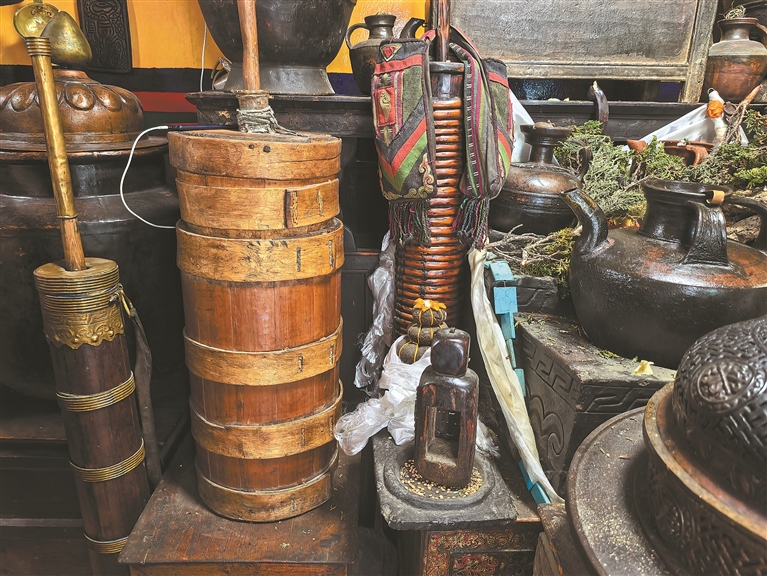 奇寶酥油桶藏傳古玩店內(nèi)的傳統(tǒng)酥油桶。記者 明吉 鄭璐 曹琳 馮琳琳 攝