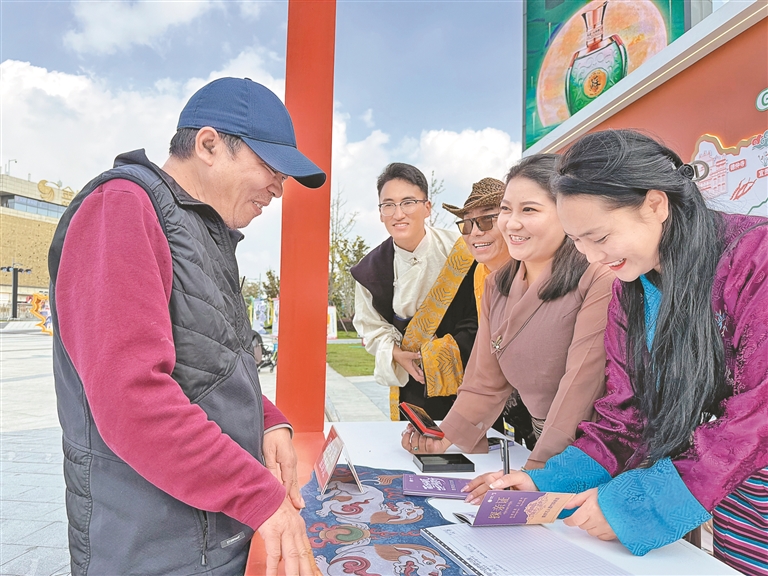 “萬人墨竹探親游”活動(dòng)的探親證發(fā)放處人潮擁擠,排隊(duì)申請領(lǐng)證的市民絡(luò)繹不絕。“我們準(zhǔn)備了1萬本免費(fèi)發(fā)放的探親證,探親證上詳細(xì)介紹了紅色文化游、藍(lán)色康養(yǎng)游、綠色生態(tài)游、文化探秘游、墨竹深度游精品線路的詳細(xì)內(nèi)容供大家選擇。屆時(shí),我們將準(zhǔn)備好香甜的青稞酒、潔白的哈達(dá)、美味的藏餐等候咱們南京的兄弟姐妹回雪域高原的墨竹家中看看、坐坐?!蹦窆たh文化旅游公司負(fù)責(zé)人扎西措姆在探親證發(fā)放現(xiàn)場介紹道。