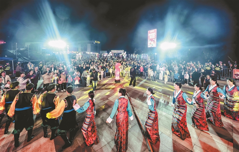 文化展演區(qū)內(nèi),伴隨著歡快的民族音樂響起,墨竹工卡縣松贊藝術(shù)團(tuán)演職人員與南京市民一起跳起了歡快的鍋莊。歌舞表演的互動(dòng)環(huán)節(jié),觀眾上臺(tái)制作糌粑,品嘗酥油茶,一系列豐富有趣的互動(dòng)環(huán)節(jié),不斷加深著各民族之間的交往交流交融,也展現(xiàn)了墨竹工卡縣各族群眾熱愛家鄉(xiāng)、團(tuán)結(jié)友善、不斷進(jìn)取的良好精神風(fēng)貌。
