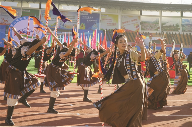 11時10分,山南市委書記李富忠宣布運動會開幕。現(xiàn)場煙花絢爛綻放,火炬手點燃主火炬,跑道前后上演的賽馬、自行車、摩托車表演點燃全場熱情,歡呼聲、喝彩聲此起彼伏。 隨后的百人非遺文藝匯演精彩紛呈。尾聲《幸福雅礱》更是將現(xiàn)場氣氛推向高潮,展現(xiàn)出雅礱兒女對美好生活的向往。