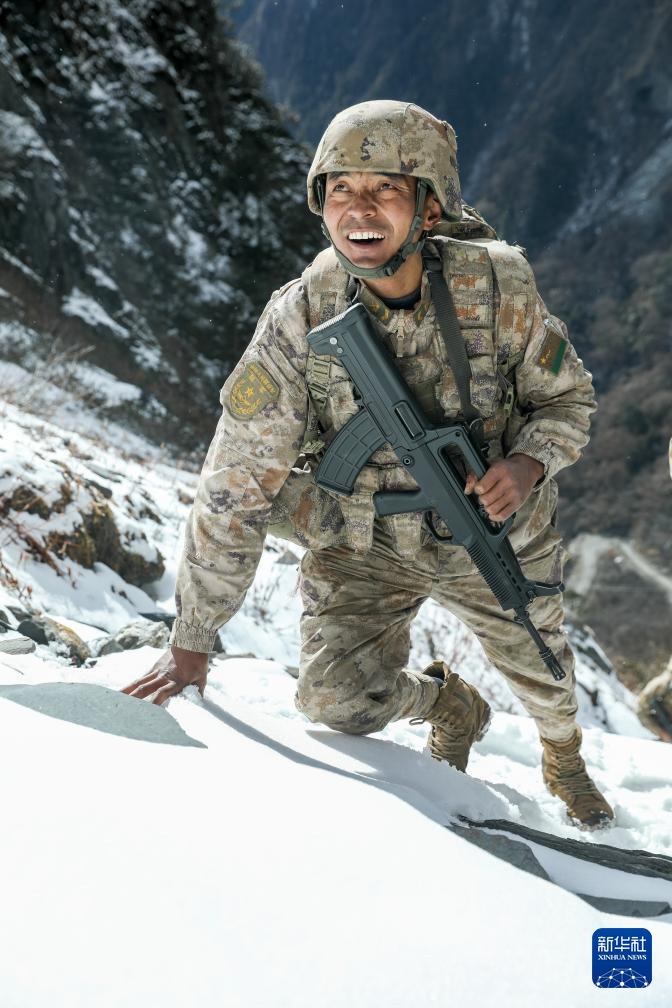 2024年1月5日,巡邏途中,西藏軍區(qū)某團一級上士次羅布和戰(zhàn)友們翻越雪山。新華社發(fā)(張照杰 攝)