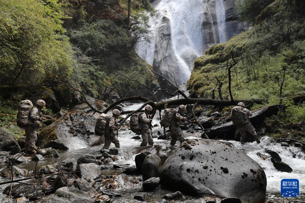 2025年11月2日,巡邏途中,西藏軍區(qū)某團一級上士次羅布(右一)和戰(zhàn)友們跋山涉水。新華社發(fā)(于達 攝)