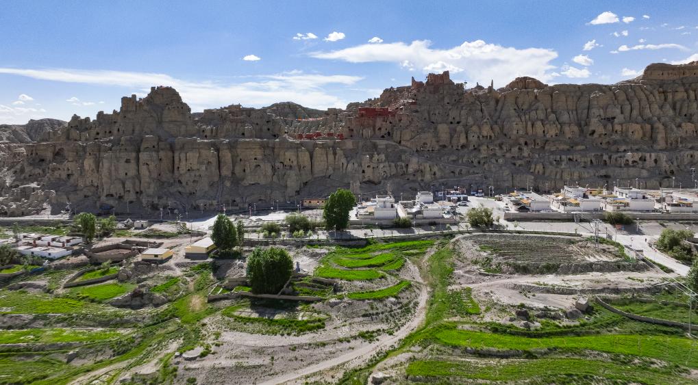 皮央石窟群與山下的村莊相互映襯(無人機照片)。新華社記者 丁增尼達(dá) 攝