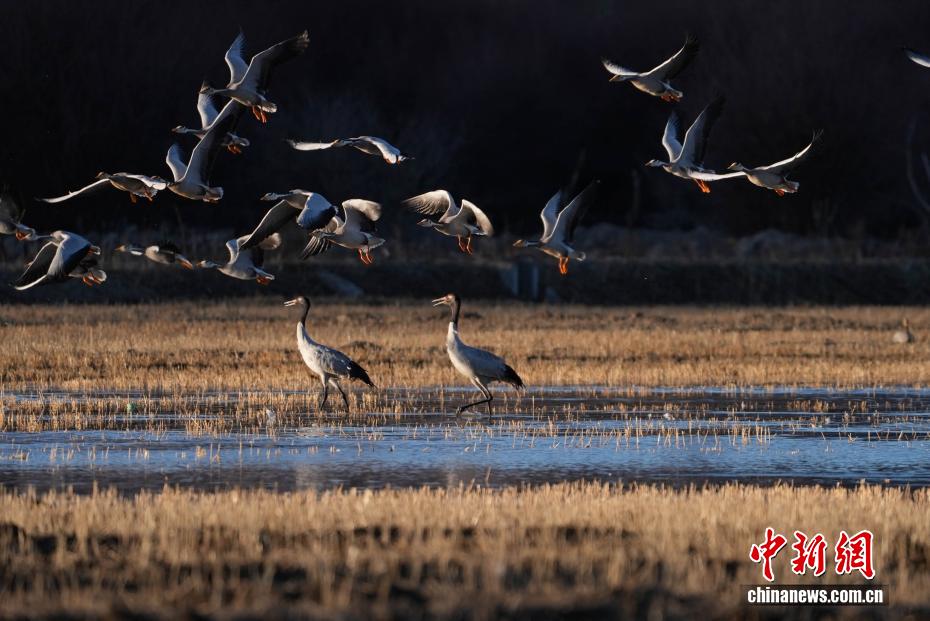11月26日,位于西藏自治區(qū)拉薩市林周縣黑頸鶴自然保護(hù)區(qū)內(nèi),大批越冬黑頸鶴現(xiàn)身卡孜水庫(kù)及田間地頭,悠閑覓食、嬉戲。這些遠(yuǎn)道而來(lái)的黑頸鶴,將在此棲息至次年三四月份。黑頸鶴為中國(guó)國(guó)家一級(jí)保護(hù)動(dòng)物,也是唯一在高原生活、繁殖的鶴類。近年來(lái),隨著當(dāng)?shù)厣鷳B(tài)保護(hù)力度持續(xù)加大,前往林周縣越冬的黑頸鶴等候鳥數(shù)量逐年增多。圖為黑頸鶴在林周縣境內(nèi)的農(nóng)田里覓食、嬉戲。貢確 攝