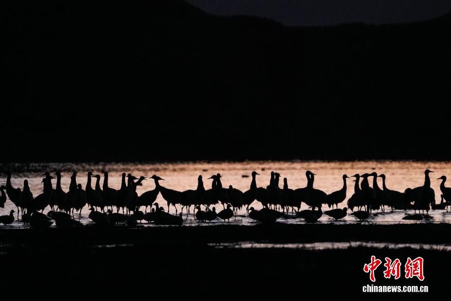11月26日,位于西藏自治區(qū)拉薩市林周縣黑頸鶴自然保護(hù)區(qū)內(nèi),大批越冬黑頸鶴現(xiàn)身卡孜水庫(kù)及田間地頭,悠閑覓食、嬉戲。這些遠(yuǎn)道而來(lái)的黑頸鶴,將在此棲息至次年三四月份。黑頸鶴為中國(guó)國(guó)家一級(jí)保護(hù)動(dòng)物,也是唯一在高原生活、繁殖的鶴類。近年來(lái),隨著當(dāng)?shù)厣鷳B(tài)保護(hù)力度持續(xù)加大,前往林周縣越冬的黑頸鶴等候鳥數(shù)量逐年增多。圖為在林周縣卡孜水庫(kù)拍攝的黑頸鶴。貢確 攝