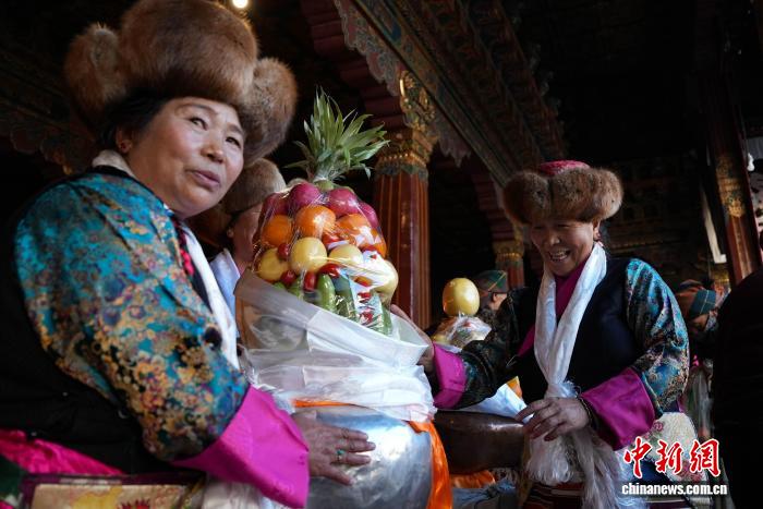 11月28日,隨著藏歷十月十五白拉姆節(jié)臨近,連日來(lái),拉薩及周邊信眾身著色彩艷麗的藏裝節(jié)日盛裝,手持從家中精心準(zhǔn)備的頭等青稞酒、新收的青稞及新鮮水果,陸續(xù)前往大昭寺、色拉寺、哲蚌寺等寺廟朝拜祈福。大昭寺內(nèi),信眾敬獻(xiàn)供品后載歌載舞,歌聲悠揚(yáng)、舞步輕快,盡顯節(jié)日喜悅。白拉姆節(jié)又稱(chēng) “仙女節(jié)”。相傳,白拉姆是拉薩地區(qū)的保護(hù)神,是藏傳佛教最高護(hù)法神之一班丹拉姆的女兒。白拉姆曾與大昭寺護(hù)法神赤尊贊相互愛(ài)慕并私定終身,其母親班丹拉姆發(fā)現(xiàn)后,赤尊贊被趕到拉薩河南岸,每逢藏歷十月十五日,二人才能隔河相見(jiàn)一次。圖為白拉姆節(jié)臨近之際,信眾在大昭寺內(nèi)敬獻(xiàn)供品后載歌載舞的場(chǎng)景。貢確 攝