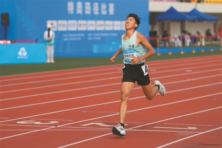 12月11日,索南加參在全國殘?zhí)貖W會(huì)特奧田徑比賽男子16—21歲組800米決賽第7組比賽中率先沖過終點(diǎn)。新華社記者 楊晨光 攝