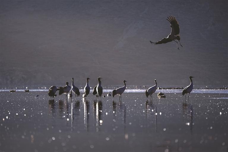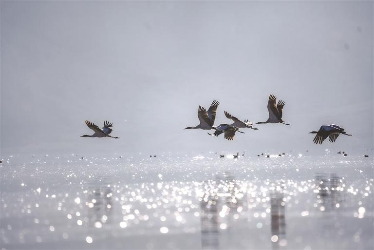近日,被譽為 “高原仙子”的國家一級保護動物黑頸鶴如期飛抵拉薩市林周縣卡孜水庫越冬,與斑頭雁、赤麻鴨等水鳥共同構(gòu)成高原濕地生態(tài)畫卷。
