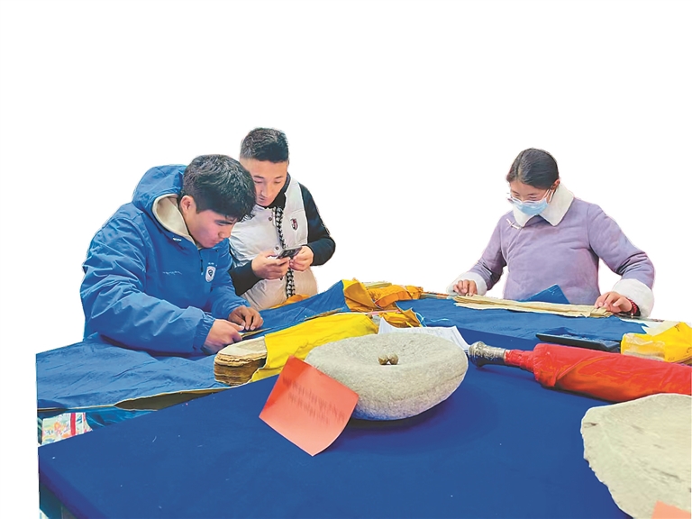 學(xué)生在藏醫(yī)展館翻閱藏醫(yī)藥技藝配方。