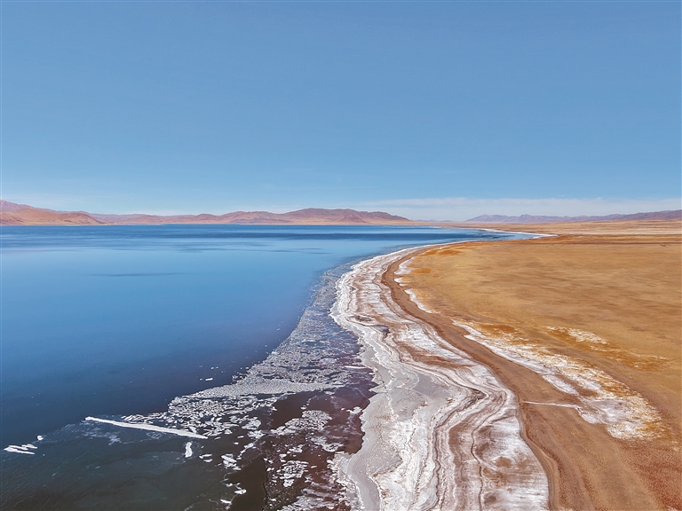 回到車上,身體漸漸暖和起來。車窗外,色林錯在夕照下變幻著色彩:近岸的浪花凍結(jié)成層層疊疊的冰凌;遠(yuǎn)處的湖面仍泛著深藍(lán)的波光,與天際線融為一體。