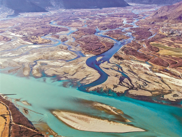 冬日的雅魯藏布江,渚清沙白、色彩斑斕,江水宛如打翻了調(diào)色盤的畫布,是高原生態(tài)之美的靈動(dòng)展現(xiàn)。在雅尼濕地,尼洋河的碧流撞進(jìn)雅魯藏布江的清波,澄澈的藍(lán)綠主色調(diào)在河道中暈染開來(lái),深淺交織的水色勾勒出蜿蜒的“水脈”,淺灘沙洲如白玉雕琢的游魚,靜靜“浮”在碧波間,將江面涂抹成一幅流動(dòng)的水彩畫。