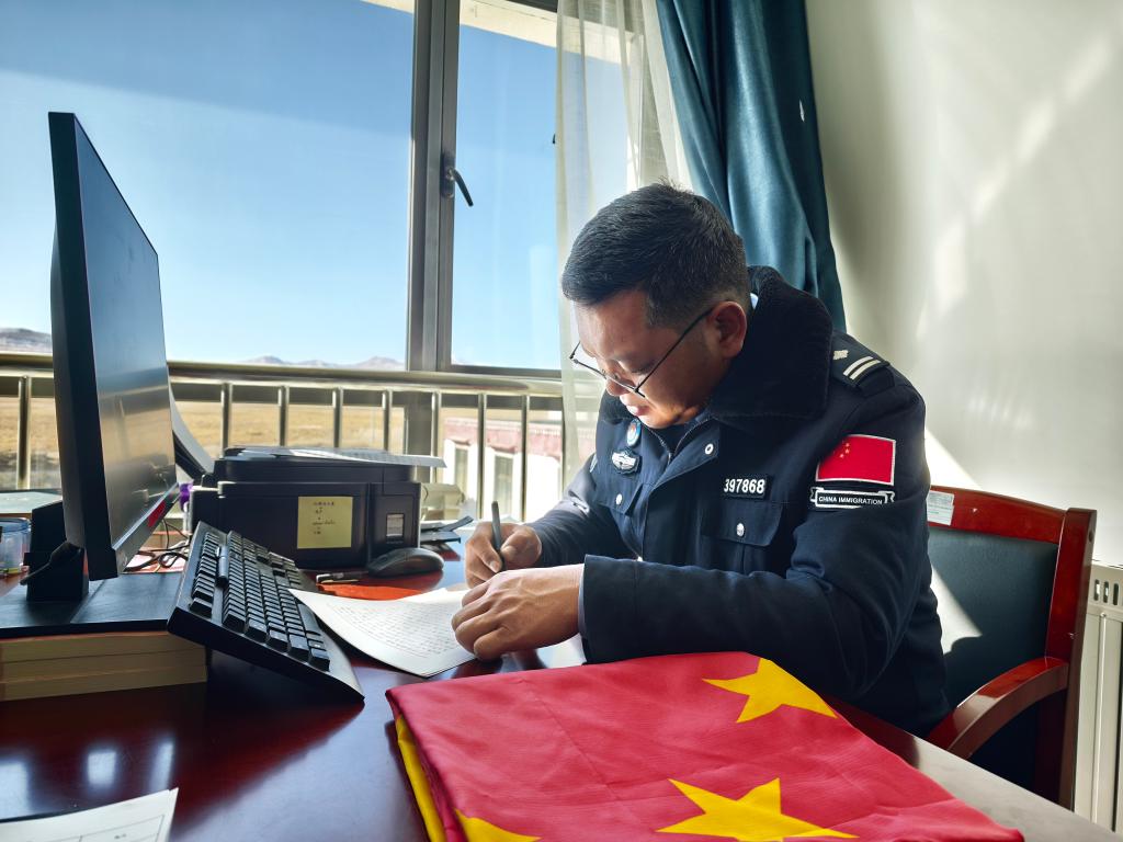 普瑪江塘邊境派出所所長普布扎西為海南大學(xué)愛心藝術(shù)團(tuán)回信。(普瑪江塘邊境派出所供圖)