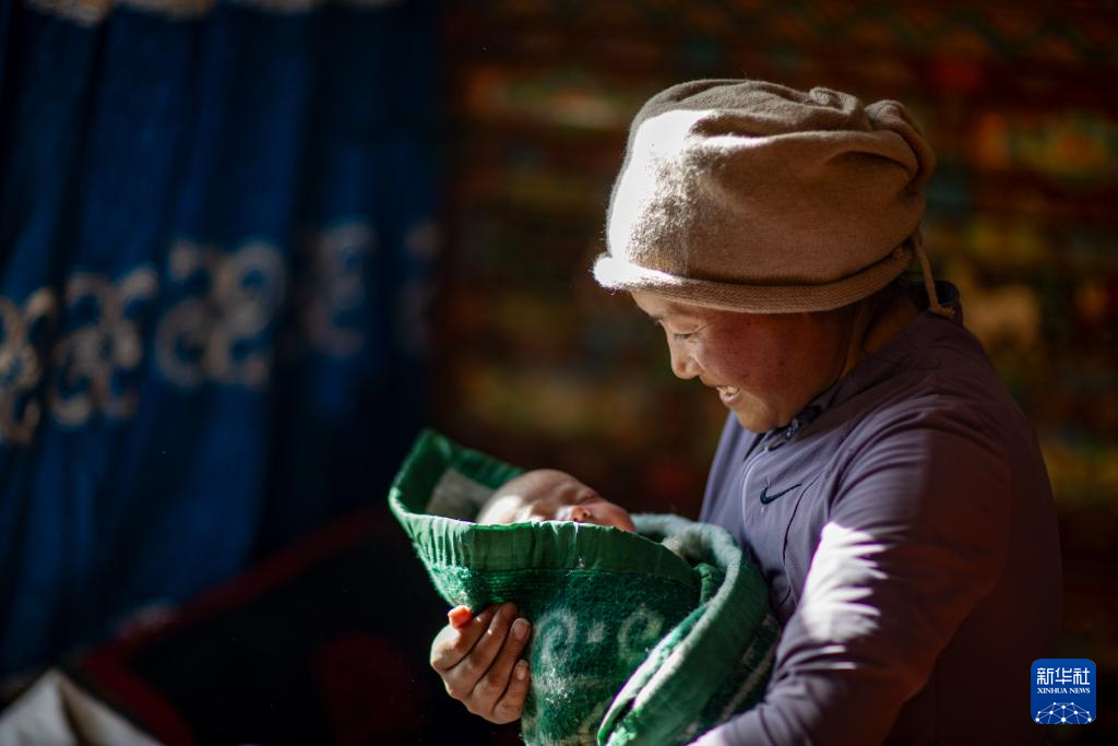 2025年1月8日,次仁拉姆抱著自己剛滿(mǎn)月的孩子格桑巴宗。新華社記者 姜帆 攝
