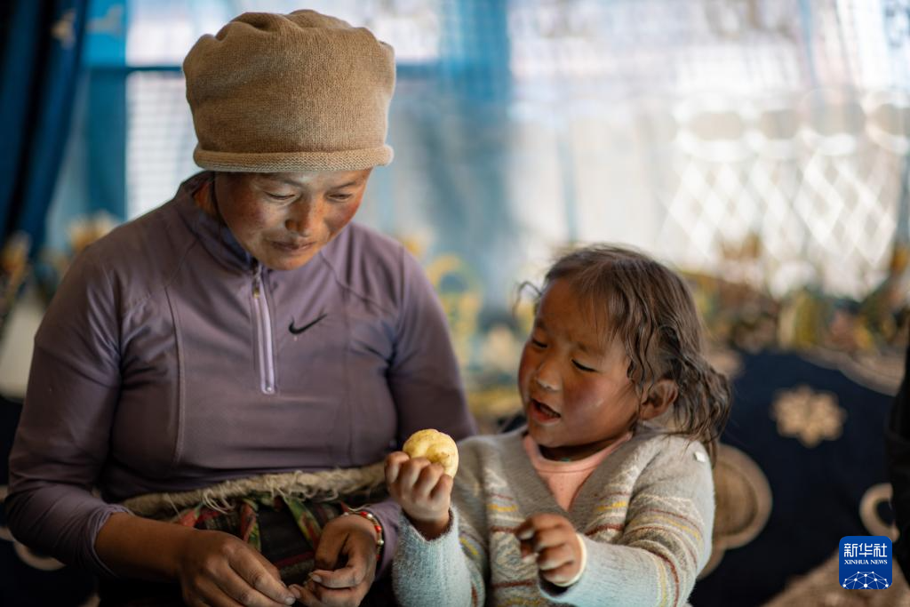 次仁拉姆(左)在新居中陪大女兒玩耍(1月5日攝)。新華社記者 姜帆 攝