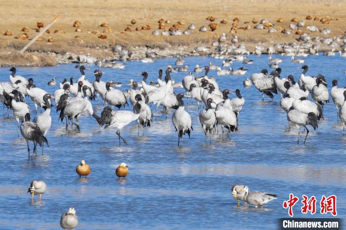 圖為拉薩林周縣虎頭山水庫,黑頸鶴正在覓食、嬉戲。貢嘎來松 攝