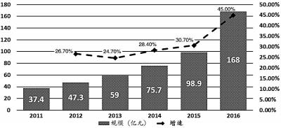 表:2011—2016我國(guó)大數(shù)據(jù)交易市場(chǎng)規(guī)模及增速 數(shù)據(jù)來源:易觀國(guó)際數(shù)據(jù)