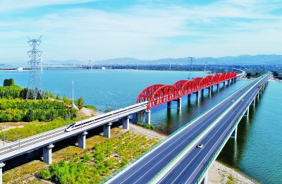 一列動車組列車從河北省懷來縣境內(nèi)的京張高鐵跨官廳水庫特大橋上通過。新華社發(fā)