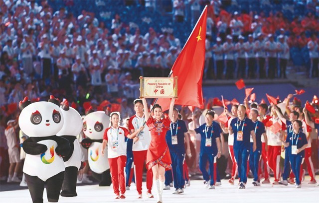 2023年7月28日,第31屆世界大學(xué)生夏季運(yùn)動會開幕式在成都東安湖體育公園主體育場舉行。圖為中國大學(xué)生體育代表團(tuán)在開幕式上入場。 新華社記者 王曦/攝