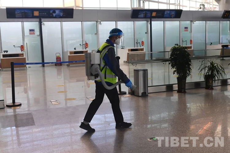 圖為拉薩貢嘎機(jī)場(chǎng)工作人員正在消毒 圖片由民航西藏自治區(qū)管理局提供