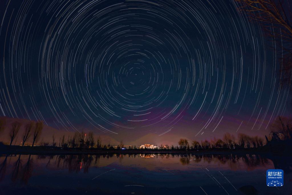 這是在拉薩市拉魯濕地拍攝的以布達(dá)拉宮為前景的星軌照片(合成照片,11月26日攝)。新華社記者 姜帆 攝