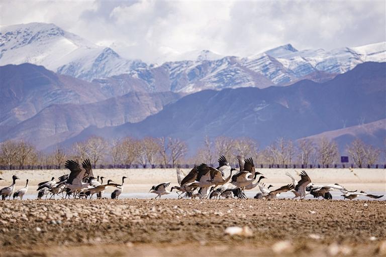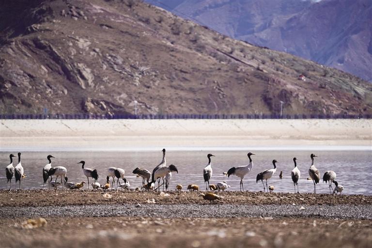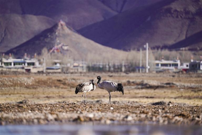 黑頸鶴是國(guó)家一級(jí)保護(hù)動(dòng)物,在藏語(yǔ)中稱(chēng)為“沖沖”。主要棲息在海拔2500米至5000米的高原、草甸、沼澤地帶。拉薩北部的林周縣平均海拔約4200米,是黑頸鶴的主要越冬地之一。最近這段時(shí)間,對(duì)拉薩市林周縣野保員們來(lái)說(shuō),一邊要忙自家的農(nóng)活,一邊還要巡查候鳥(niǎo)情況。“已經(jīng)有一小部分飛走了,估計(jì)再過(guò)半個(gè)月都會(huì)陸續(xù)飛走?!?月23日上午,野保員旦增告訴記者,在虎頭山水庫(kù)和卡孜水庫(kù)越冬的候鳥(niǎo)有一部分已經(jīng)飛走了。野保員口中的“飛走”便是遷徙,遷徙是候鳥(niǎo)的本能,一年一年,跟隨時(shí)間的召喚,完成兩次遷徙:繁殖和越冬。