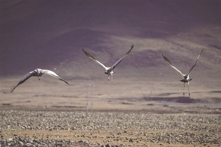 在西藏,黑頸鶴從越冬地到繁殖地有兩條線(xiàn)路:一條是拉薩到色林措,另一條則是從日喀則到色林措。整體來(lái)說(shuō),是從雅魯藏布江中游河谷黑頸鶴國(guó)家級(jí)自然保護(hù)區(qū)飛往色林措黑頸鶴保護(hù)區(qū),兩個(gè)保護(hù)區(qū)之間有一條固定的黑頸鶴遷徙路線(xiàn),每年黑頸鶴會(huì)在3月中旬從越冬地雅江中游河谷及其支流拉薩河、年楚河流域的“一江兩河”地區(qū),飛去羌塘北部草原繁育后代;又會(huì)于11月中旬從繁殖地那曲的班戈縣、申扎縣、嘉黎縣,阿里的日土縣、普蘭縣,日喀則的昂仁縣,拉薩的當(dāng)雄縣返回到越冬地。對(duì)于雅江中游河谷來(lái)說(shuō),它是冬候鳥(niǎo);對(duì)于羌塘北部草原來(lái)說(shuō),它是夏候鳥(niǎo)。