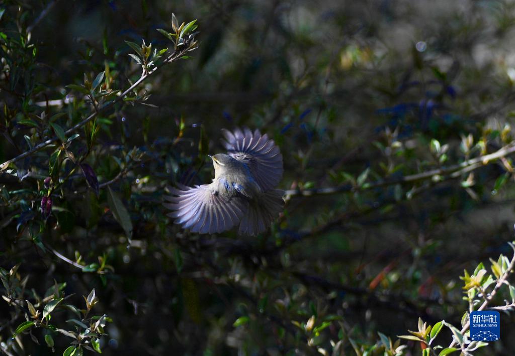 一只柳鶯在樹(shù)枝間飛行(4月24日攝)。新華社記者 張汝鋒 攝