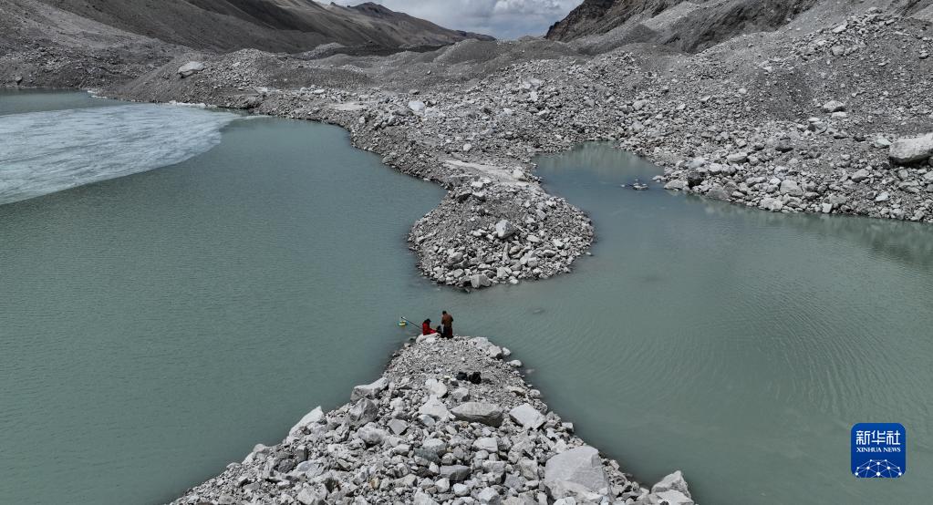 在珠峰海拔約5300米處的冰前湖,科考隊(duì)員在取水樣(5月12日攝,無人機(jī)照片)。新華社記者 晉美多吉 攝