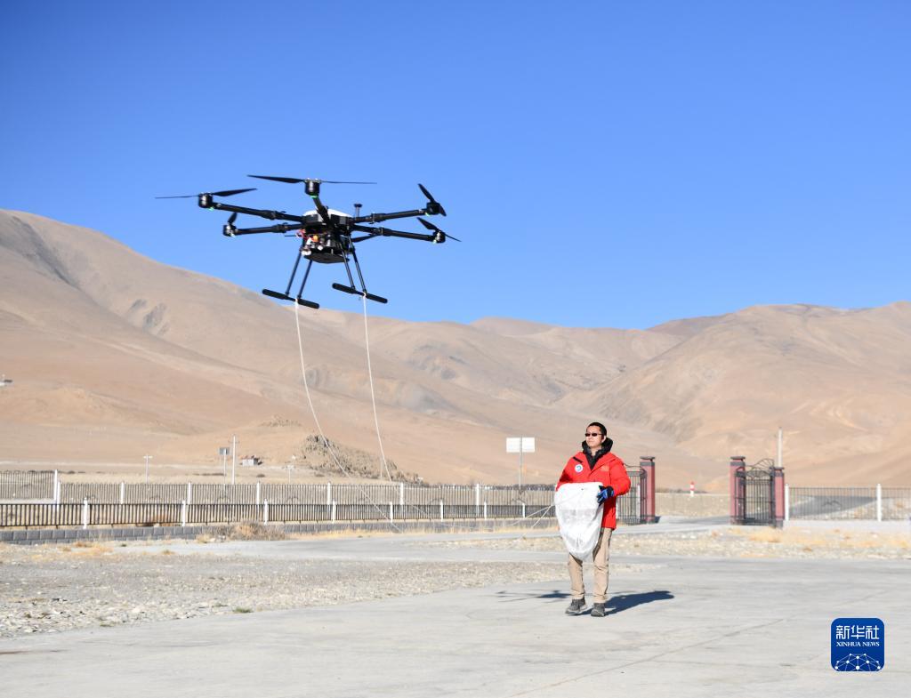 在中國科學(xué)院珠穆朗瑪大氣與環(huán)境綜合觀測研究站,科考隊(duì)員放飛無人機(jī)采集空氣樣本(5月10日攝)。新華社記者 晉美多吉 攝