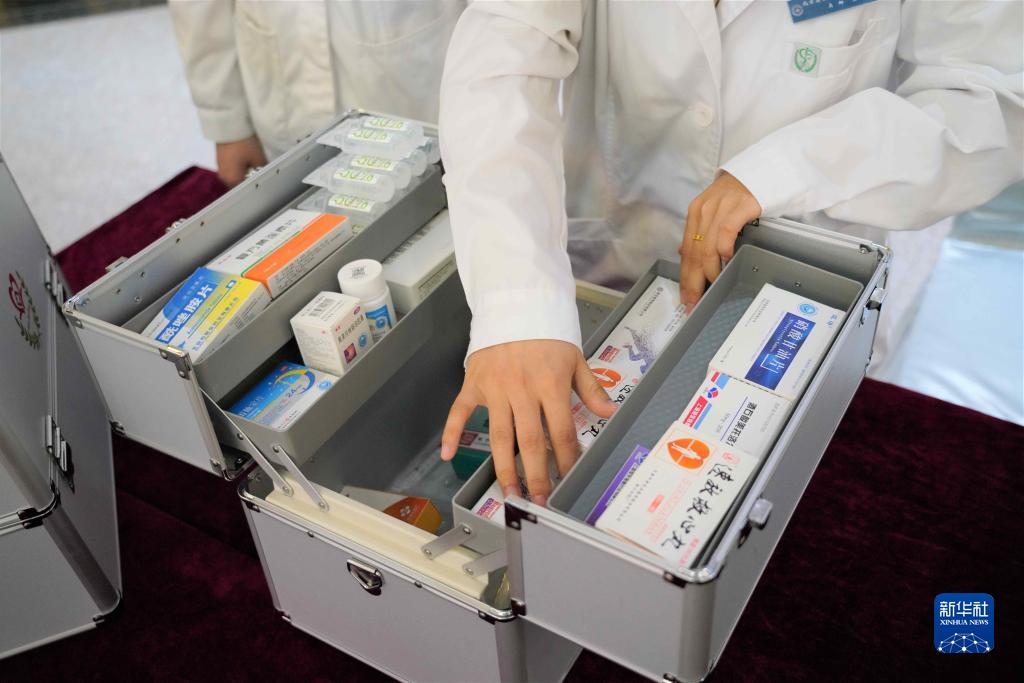 5月26日,北京高原適應(yīng)研究康復(fù)中心的醫(yī)護(hù)人員在介紹隨車醫(yī)藥箱。新華社發(fā)(王靜頤攝)