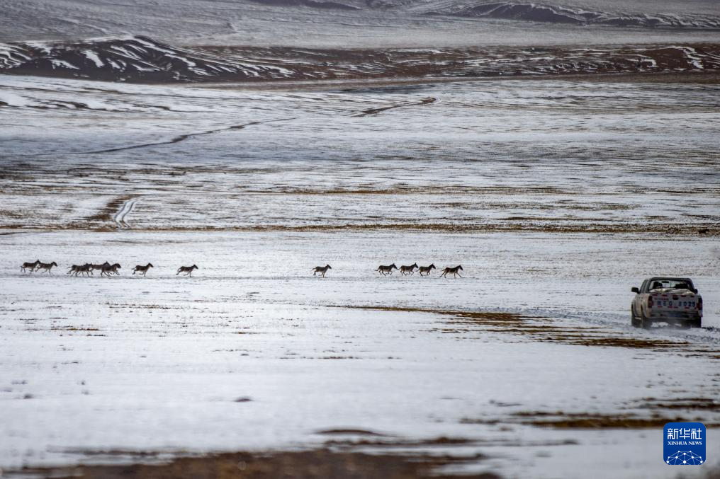 成群的藏野驢從野生動物專業(yè)管護隊員們的車前跑過(5月9日攝)。新華社記者 姜帆 攝 ??