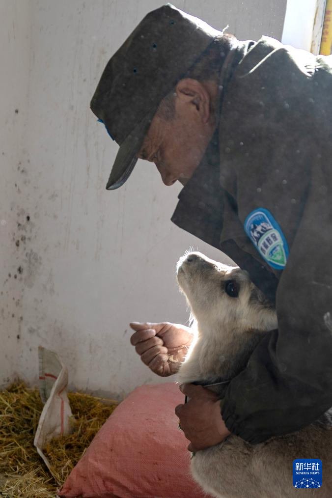 ??羅布玉杰站的野生動物專業(yè)管護隊員在出發(fā)巡護前給站里救護的受傷藏原羚喂糌粑(5月7日攝)。新華社記者 姜帆 攝