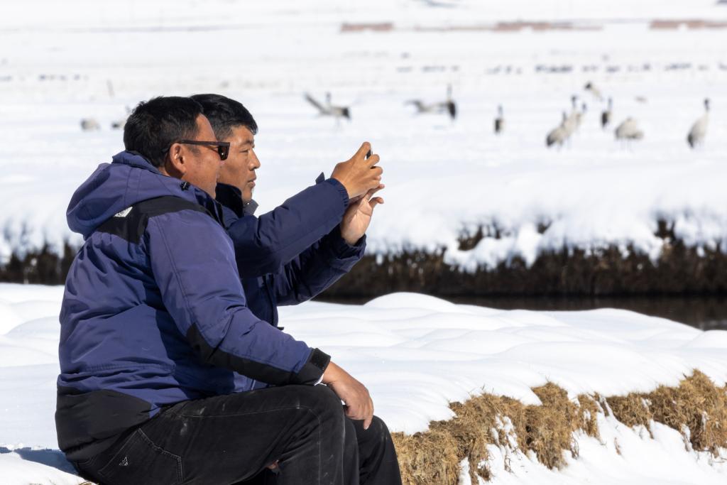 當(dāng)雄縣野生動(dòng)物疫源疫病監(jiān)測(cè)員尼瑪頓珠(左)和同事扎西頓珠在雪后的阿熱濕地觀(guān)察遷徙途中的黑頸鶴(2024年4月7日攝)。 新華社記者 姜帆 攝