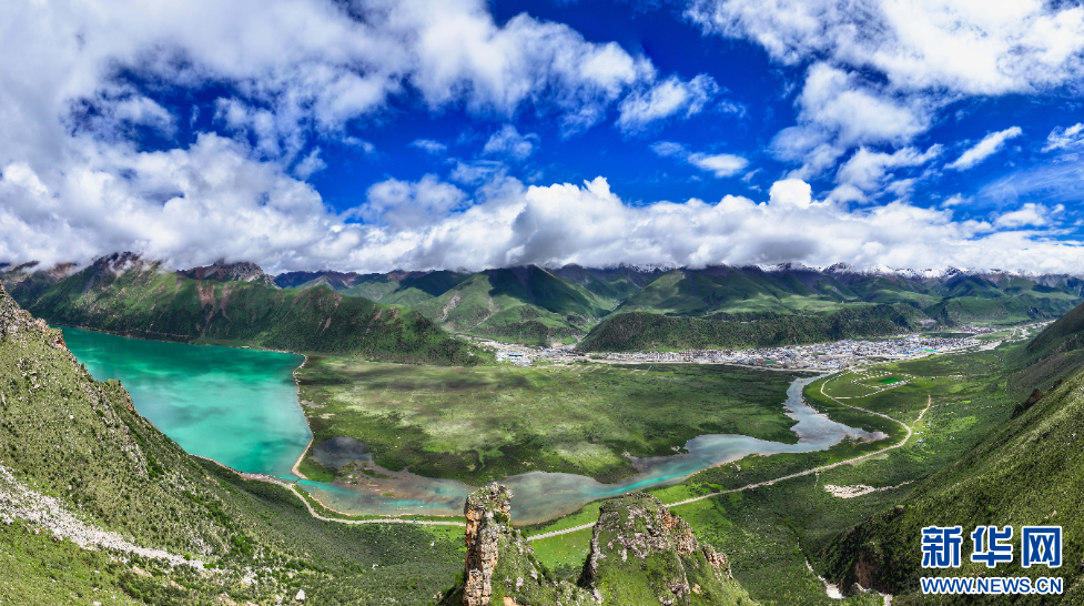 圖為7月2日拍攝的嘉乃玉錯與不遠(yuǎn)處的嘉黎縣縣城(無人機(jī)照片)。新華網(wǎng)發(fā) 車宇軒 攝