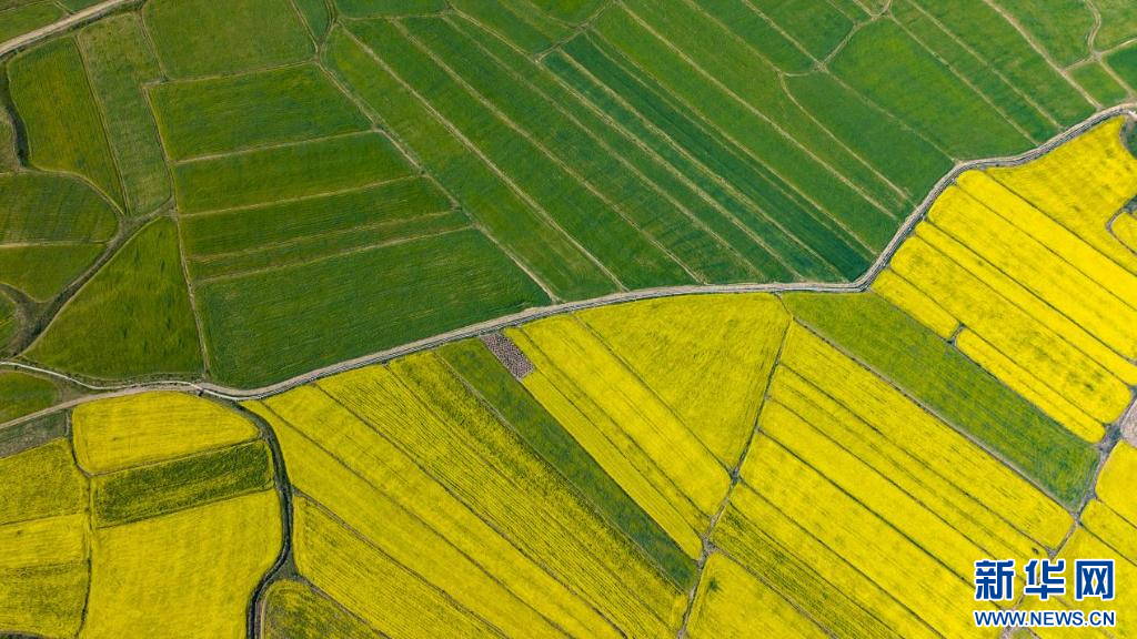圖為7月2日拍攝的俯瞰墨竹工卡縣扎西崗鄉(xiāng)加爾多村油菜花田(無人機(jī)照片)。新華網(wǎng)發(fā) 洛克 攝