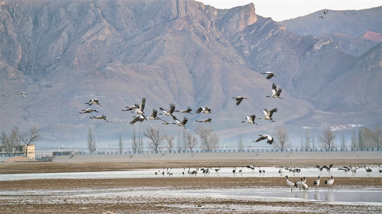 圖為1月17日,在拉薩市林周縣拍攝的黑頸鶴。記者 歐珠次仁 實(shí)習(xí)生 胡成飛 攝