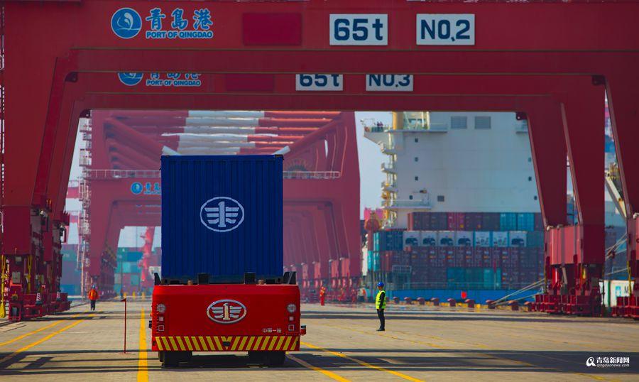 青島港全自動運輸車行駛中。