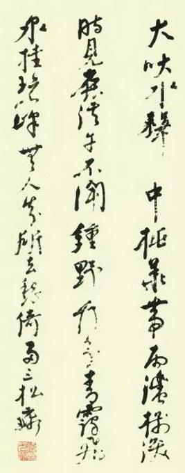 倪元璐書法流利秀雅,兼有澀勁樸茂的風(fēng)貌,風(fēng)骨凌厲,異態(tài)高古,格調(diào)曠達(dá)。用筆深得顏魯公厚實(shí)勁健之筆意,更為勁峭,結(jié)體趨于扁方,呈欹側(cè)之勢,以險寓正,風(fēng)格奇倔剛毅,自成一格。此行書豎幅《李白< ="" ="" ="" ="">》,絹本,縱103.7cm,橫60.3cm,現(xiàn)藏上海博物館。