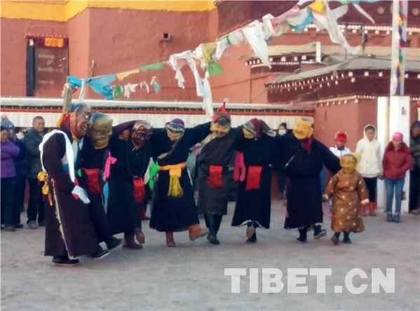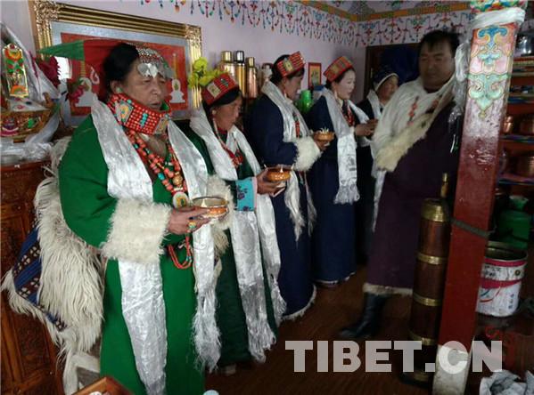 據(jù)了解,在藏歷十月三十白天,婦女們給孩子和自己洗發(fā),準(zhǔn)備過年的材料,如釀制青稞酒、制作油炸果子等。晚上10點(diǎn)左右,家中派出男性,舉行驅(qū)鬼儀式。大年初一的上午,全村的男人們騎上駿馬,到村落的山神處祭祀,更換經(jīng)幡,誦經(jīng)祈福。各家各戶回家后就在家中聚會(huì),一般是不出去的,個(gè)別時(shí)候,家中派出兩三個(gè)青年男女手持青稞酒和酒碗,端著切瑪盒,切瑪盒內(nèi)裝有青稞、糌粑、五彩的吉祥草,帶上青稞酒,到隔壁鄰居或親戚家拜年,見面后,互相祝福吉祥,敬獻(xiàn)青稞酒,各自抓起對(duì)方切瑪盒內(nèi)的青稞粒拋向空中,摔三下,祭拜天、地、神,祈禱新年吉祥如意。
