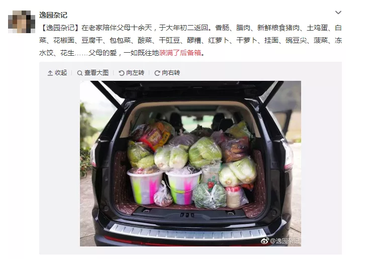 昨日,游子們從家這個(gè)港灣里,鳴笛啟航,奔向遠(yuǎn)方。除了對(duì)鄉(xiāng)愁的百轉(zhuǎn)千回,更有親情的濃郁化不開(kāi)。這幾天,網(wǎng)友們都在微博里曬圖,“媽媽給裝的后備箱”的話題,一時(shí)成了熱點(diǎn)——“親手做的馬蹄糕”“最愛(ài)的家鄉(xiāng)小柚柑”“一大罐子土榨花生油”“秋天腌的糖蒜”……后備箱被爸媽塞得滿滿的,不愿帶還不高興。于是乎,調(diào)皮的網(wǎng)友留言:“明年我開(kāi)個(gè)貨車(chē)回來(lái)過(guò)年!”