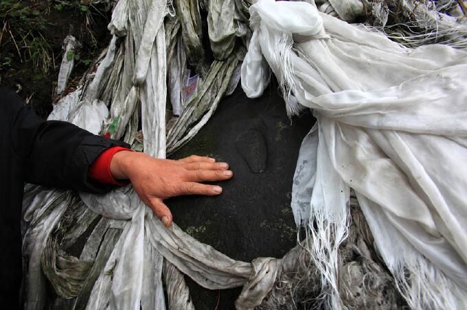我們從瀑布旁的一座房屋穿過去,就到了森木扎寺。這座寺院只是一間12平方米左右的石頭小屋,只能被稱作佛堂。木板搭成的屋頂掛著經(jīng)幡,寺院外面是一個(gè)已經(jīng)被熏黑的煨桑爐。寺里沒有一名僧人,平時(shí)只有一名61歲的管家阿旺列夏看管,他是勒布溝的門巴族,曾是一名寧瑪派僧人。據(jù)阿旺列夏介紹,森木扎曾有一個(gè)作惡的女妖,蓮花生大師用神力將她扎于此,于是建起了這座寺廟。我們隨他來到蓮花生大師修行洞內(nèi),他指著石壁上面的四處腳印,稱有處腳印是倉央嘉措留下的,他還指著瀑布旁邊的一塊石頭說:“這就倉央嘉措的寶座,曾是他給信教群眾講經(jīng)說法的地方?!?/p>