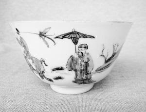 在茶盅底部,有大清光緒年制的底款,看來正制作于該時(shí)期。光緒年間,正是我國最后一個(gè)封建王朝清朝的黃昏之旅,國家內(nèi)憂外患,官員自保不暇,百姓人人自危,似在走向窮途末路。制作茶盅的匠人,大概也希望能像畫面中的老者一樣,回鄉(xiāng)隱居,在山間林舍終老一生。但對于受官府管控的皇家官窯工匠來說,這樣的愿望,無異是一種可望而不即的奢望。