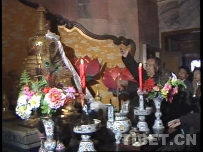 圖為1987年4月,十世班禪大師和阿沛o阿旺晉美率領(lǐng)援助西藏發(fā)展基金會籌備委員會委員朝拜靈光寺佛牙舍利塔,并親自敬獻(xiàn)哈達(dá)。