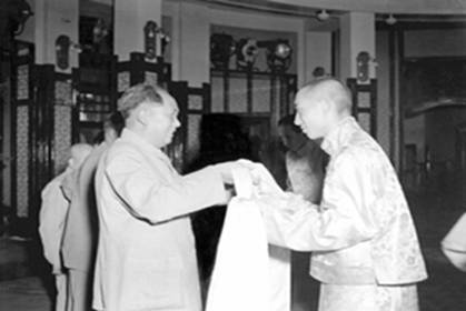 圖為十世班禪向毛澤東主席敬獻哈達。1954年,十世班禪受到毛主席等國家領(lǐng)導(dǎo)人的親切接見。他敬獻給毛主席的珍貴禮品表達了熱愛祖國大家庭、擁護黨的民族政策和人民領(lǐng)袖的心情。圖片來源:中國西藏之聲網(wǎng)